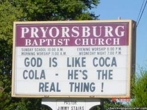 Silly Church October 5, 2007September 11, 2009 / Daniel Waugh Francis Schaffer said that the world doesn’t take the church seriously because the church isn’t serious (Evangelical Ghetto). Ah, yeah! I wish this were the worst example of evangelical silliness, but it’s a much deeper issue, and more serious issue than stupid church signs. Rate this:Share this: Click to share on Facebook (Opens in new window) Facebook Click to email a link to a friend (Opens in new window) Email Click to share on X (Opens in new window) X Click to print (Opens in new window) Print Like Loading... Related