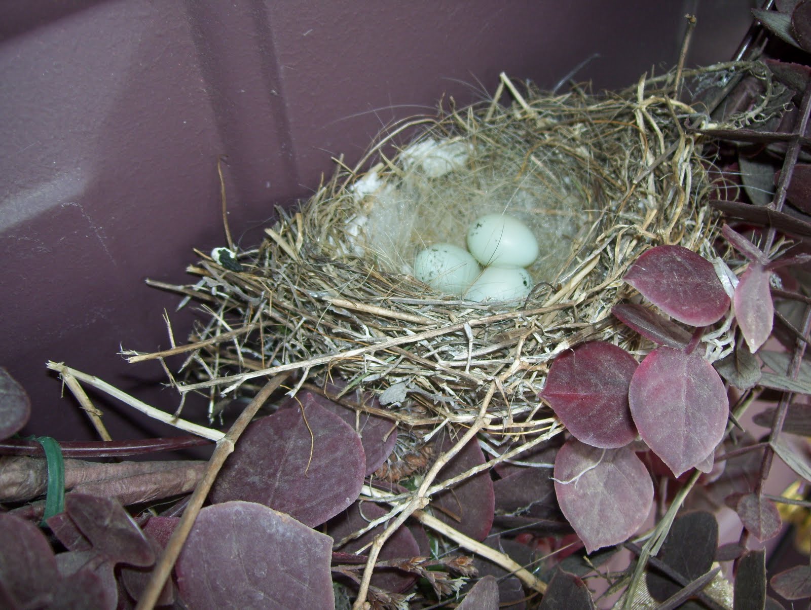 >Birds tend to build nests in weird places around our house. Last year, it was on the kids playset, right at the top of the slide. We moved it, the bird rebuild it. This year the bird built it in the wreath on our front door. Every morning, I walk out the door and the bird flies away, scaring the crap out of me. Three little eggs, which will mean three chirping baby birds soon!